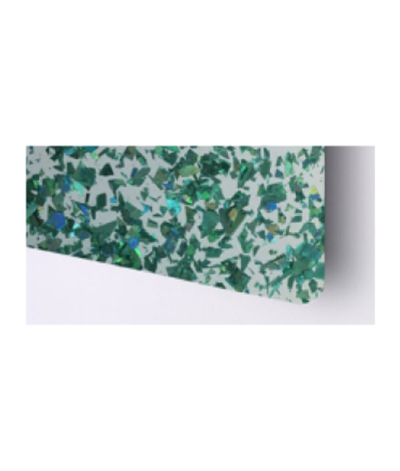 Cast acrylic in which glitter particles are evenly distributed throughout the material