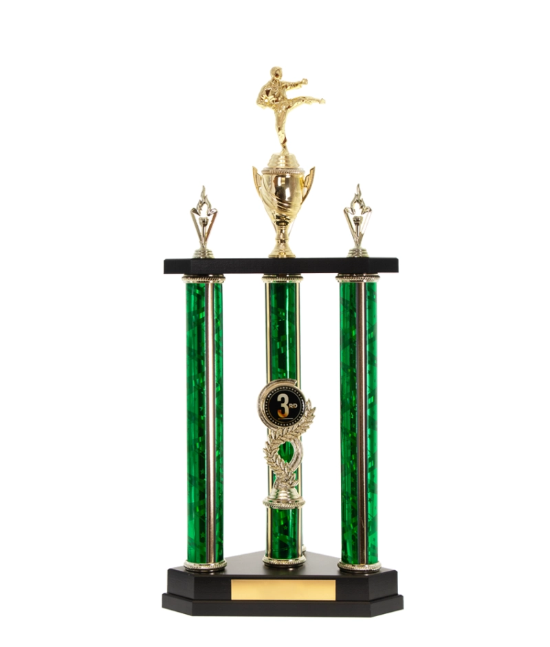Trophy height does not include the figurine, cup or corner trims. Trophies are available in vibrant colours. This trophy is suitable as a perpetual award. We can add a back plate for annual engraving. Price includes G.S.T.